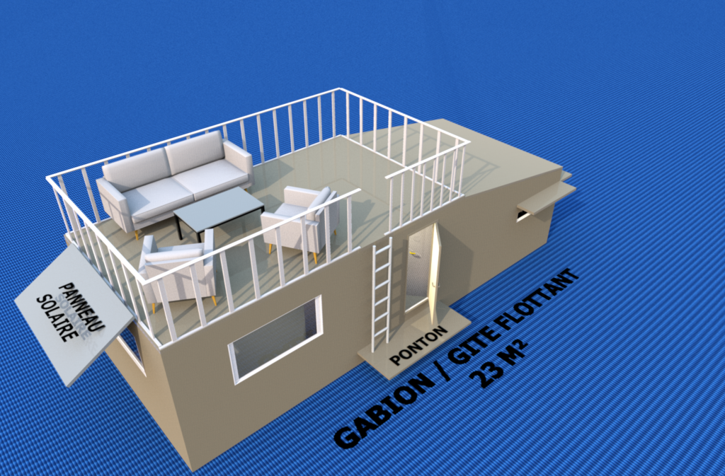 Gîte atypique flottant de 23m² au milieu d’un étang avec un ponton et un toit terrasse.