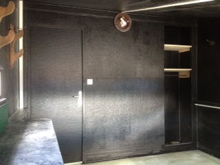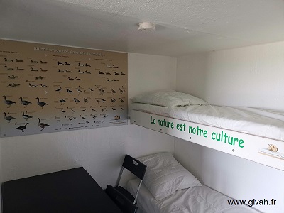 Nous y avons intégré : un préau, des porte-bottes, des rateliers à fusils, des porte-manteaux, les éléments de cuisine, frigo, micro-ondes, les lits sur mesure, les matelas, le WC, l’aspirateur sans fils, le chauffe-eau, la moquette, le gazon synthétique sur le toit…